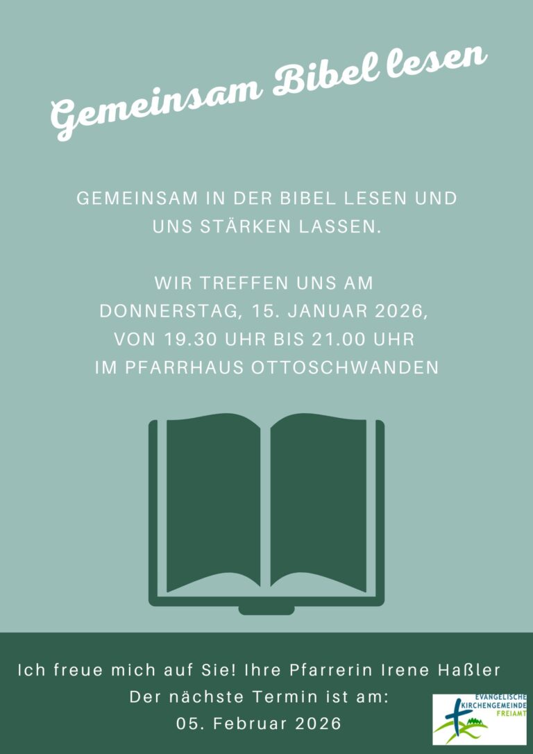 Dafür lade ich Sie am Donnerstag, dem 15. Januar 2025, um 19.30 Uhr recht herzlich ins Pfarrhaus Ottoschwanden ein. Auf Ihr Kommen freut sich Ihre Irene Haßler