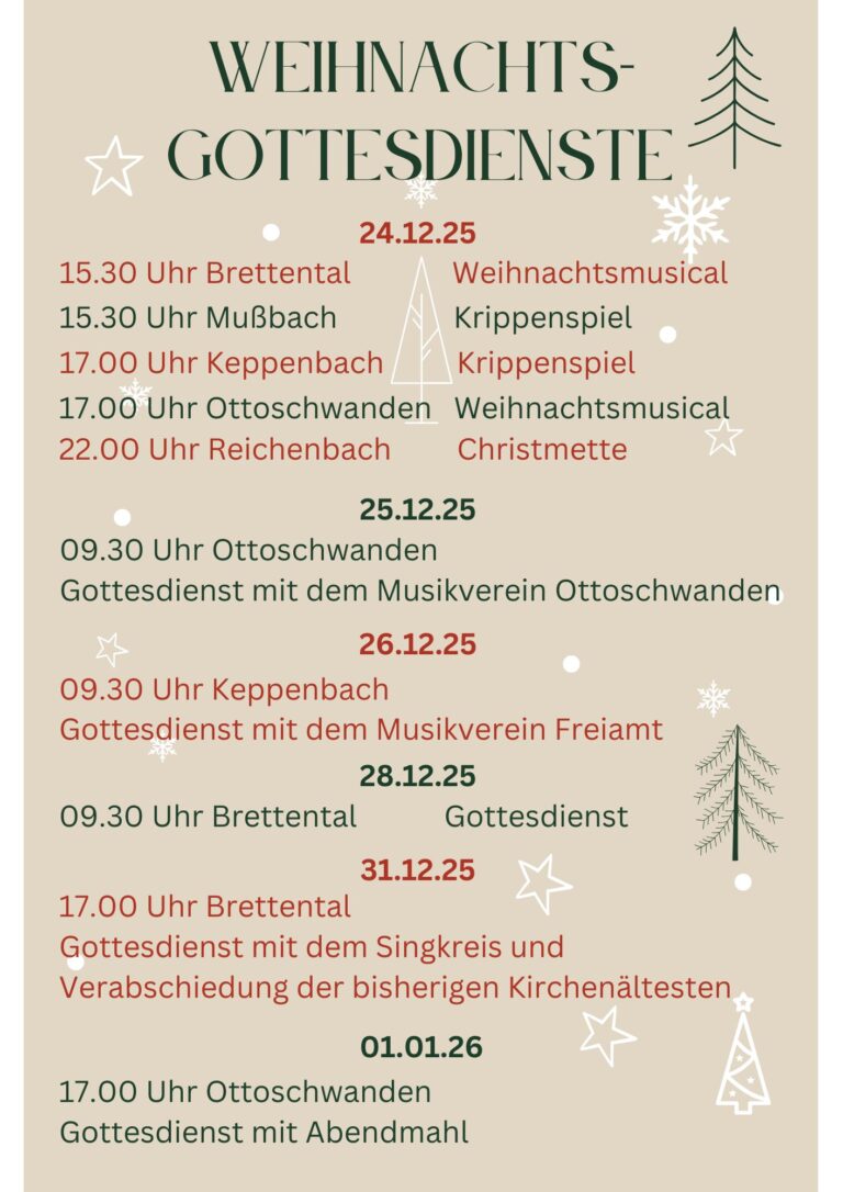 Während wir unsere regelmäßigen Sonntags-Gottesdienste auch über diesen Winter in unserer „Winterkirche“ im Brettental feiern, bieten wir am Heiligen Abend in jeder unserer Kirchen einen Weihnachtsgottesdienst an, in Mußbach und Keppenbach mit Krippenspiel, in Brettental und Ottoschwanden mit Weihnachts-Musical, in Reichenbach als Christ-Mette.