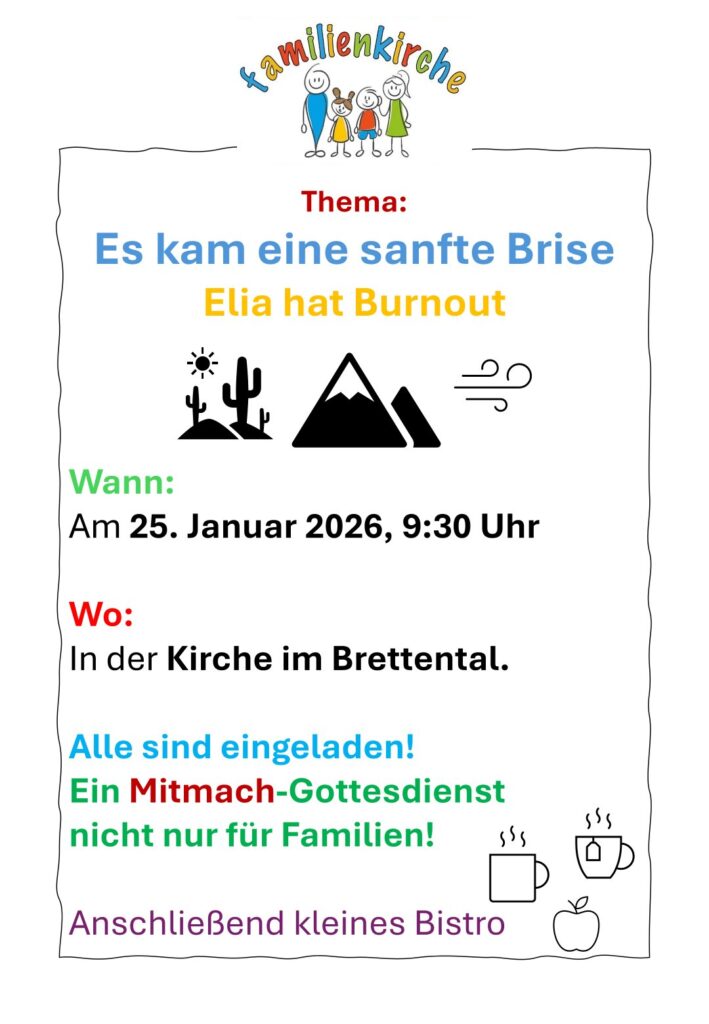 Herzliche Einladung zur Familienkirche im Brettental am 25. Januar 2026 um 9:30 Uhr. Familienkirche heißt Gottesdienst mit allen Sinnen erleben. Es gibt viel zum Anfassen,